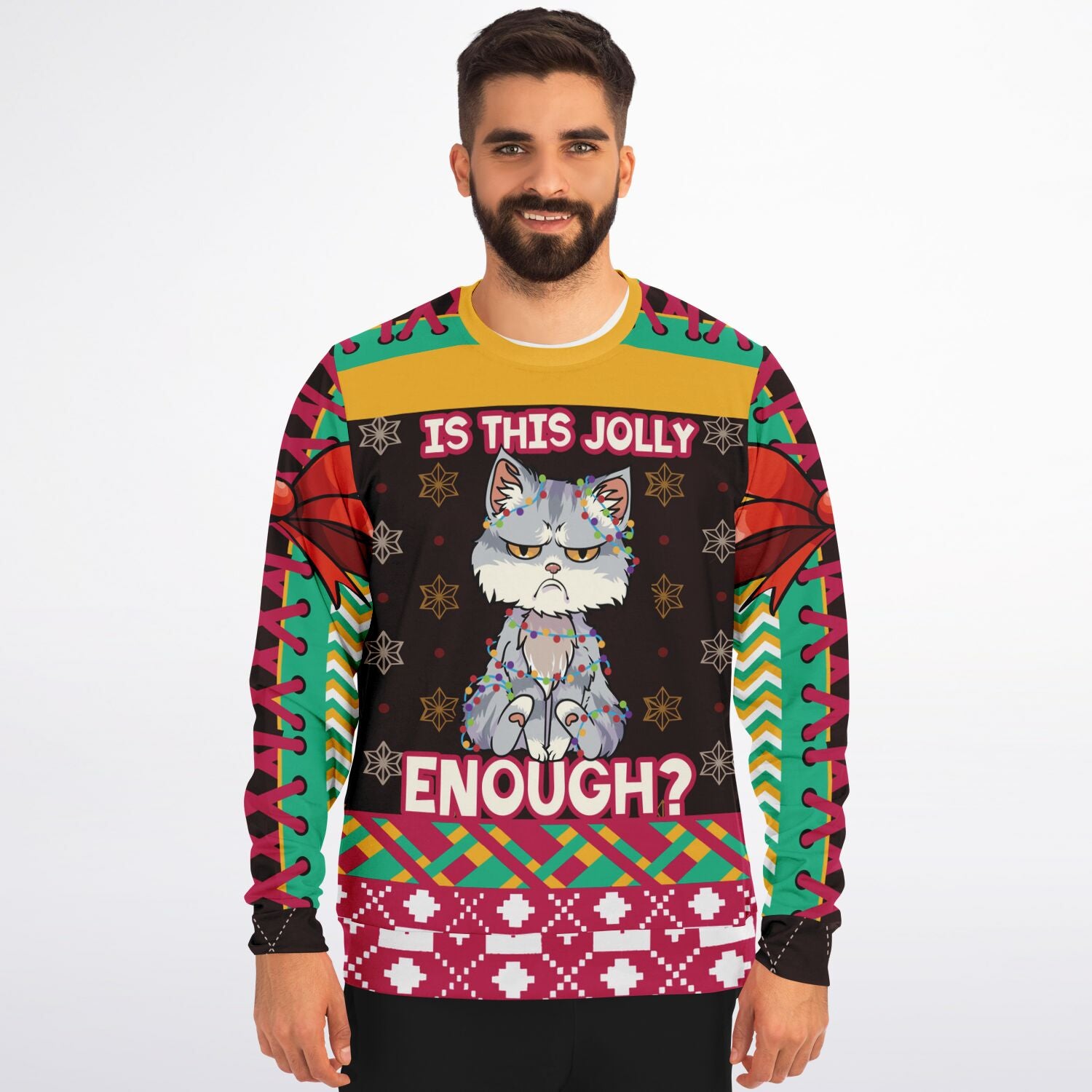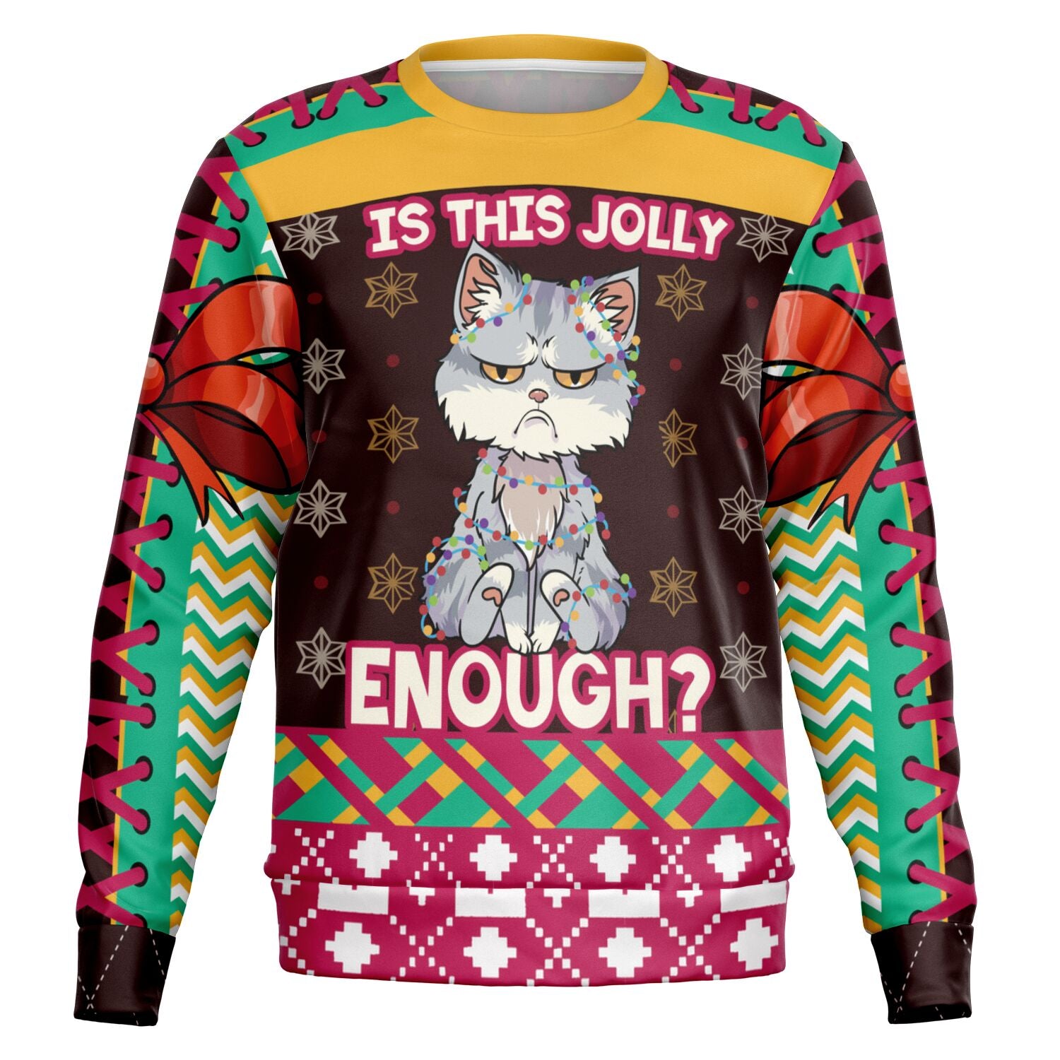 Embrace your inner grump this holiday season with the “Is This Jolly Enough?” Christmas sweatshirt featuring a hilariously unimpressed cat wrapped in Christmas lights. With a blend of bright holiday colors and bold patterns, this design perfectly captures the reluctant festive spirit. The sarcastic message paired with the grouchy feline makes this sweatshirt the ultimate choice for those who love to add a bit of humor to their holiday wardrobe. Perfect for cat lovers, introverts, or anyone who finds the holiday cheer a little overwhelming!