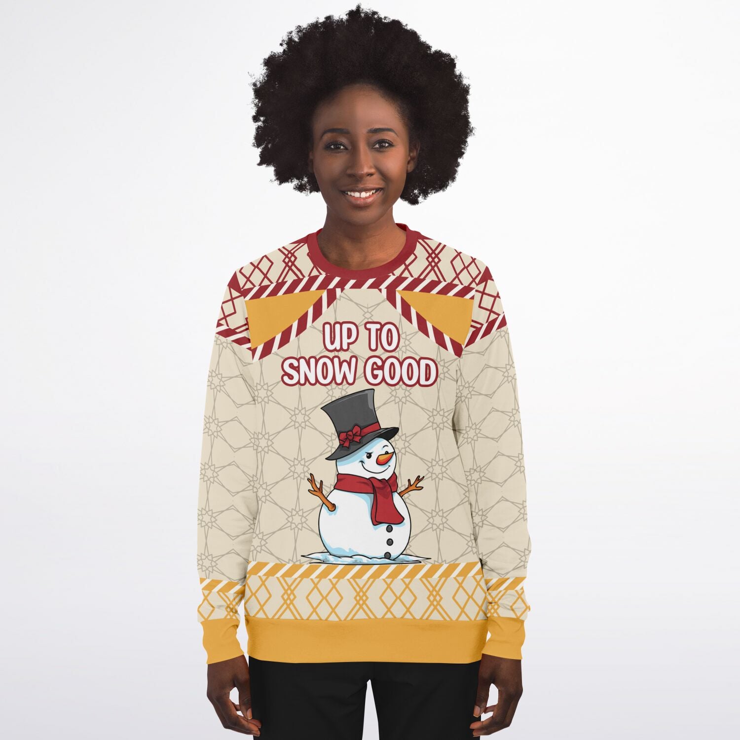 Get into mischief this holiday season with the “Up to Snow Good” sweatshirt, featuring a playful snowman ready for some frosty fun. With its vibrant design and cheeky phrase, this sweatshirt is perfect for anyone who enjoys bringing a bit of humor to winter festivities. Whether you’re at a Christmas party, out for holiday shopping, or just lounging at home, this sweatshirt will keep you cozy and smiling. A great gift for those who love snow puns and want to show off their fun side during the holidays!